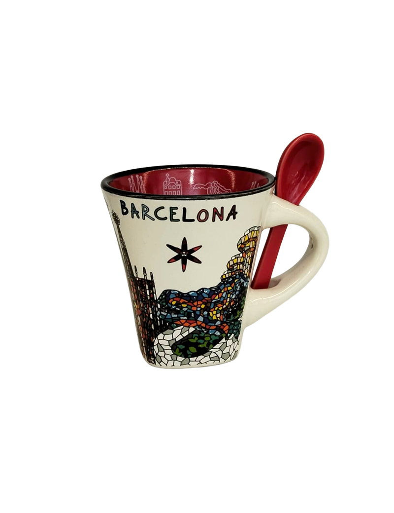 A full-color mug decorated with the inscription Barcelona and the Gaudí`s molt iconic creations It is convenient because it has a groove on the handle where the spoon is attached.